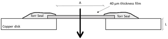The packaging sample, with a thickness of approximately 40 μm and an exposed area of 7.1 mm2, was mounted on a perforated copper disk compatible with ultra-high-vacuum flanges CF16, then located between an upstream and a downstream high-vacuum chamber. A thin layer of Torr Seal® was then spread on the interface between the copper disk and the sample, ensuring vacuum sealing and negligible leakage. A schematic representation of the assembly is shown in Figure 2. Before any measurements, the assembly was tested by checking the mechanical seal at 1 atm of upstream pressure of air. Furthermore, a leak test carried out with helium verified the seal of the flanges by monitoring the signal in the downstream chamber with a residual gas analyzer (RGA).