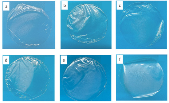 PLA-based films were produced by using the solvent casting method. First, an optimization study was undertaken to investigate the effect of the polymer-to-solvent ratio and plasticizer concentration (PEG 400) on the features of the obtained films. PEG 400 concentrations from 0 to 20% (w/w) were tested, but the presence of the plasticizer led to low polymer transparency and halos, as shown in Figure 3a, without significant advantages in terms of versability of the polymer solution, homogeneity of the film, and surface smoothness. Concerning the polymer-to-solvent ratio, this variable affected the solution versability being directly related to the solution viscosity, i.e., polymer-to-solvent ratios below 8% w/v provided films that were too thin, hard to be peeled from the mold, and fragile. It did not significantly affect the final film thickness, which comprised results between 40 and 50 µm at the conditions tested. Furthermore, since chloroform is extremely volatile, the initial solvent evaporation rate was decreased by covering the molds with a perforated aluminum foil, and a good transparency was obtained. An optimal drying time of 72 h was finally selected. Figure 3 shows some films obtained in the various process optimization steps. Therefore, the optimal conditions to produce the films were a polymer-to-solvent ratio of 8% w/v, without the addition of plasticizer, and a drying time of 72 h.