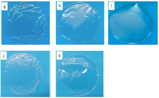 PLA-based films obtained using (a) polymer-to-solvent ratio = 4% (w/v), PEG 400 = 0% (w/w), drying time = 12 h; (b) polymer-to-solvent ratio = 4% (w/v), PEG 400 = 10% (w/w), drying time = 12 h; (c) polymer-to-solvent ratio = 4% (w/v), PEG 400 = 20% (w/w), drying time = 12 h; (d) polymer-to-solvent ratio = 5% (w/v), PEG 400 = 0% (w/w), drying time = 12 h; (e) polymer-to-solvent ratio = 5% (w/v), PEG 400 = 20% (w/w), drying time = 12 h; (f) polymer-to-solvent ratio = 5% (w/v), PEG 400 = 20% (w/w), drying time = 12 h; (g) polymer-to-solvent ratio = 6% (w/v), PEG 400 = 0% (w/w), drying time = 12 h; (h) polymer-to-solvent ratio = 6% (w/v), PEG 400 = 10% (w/w), drying time = 12 h; (i) polymer-to-solvent ratio = 6% (w/v), PEG 400 = 20% (w/w), drying time = 12 h; (j) polymer-to-solvent ratio = % (w/v), PEG 400 = 0% (w/w), drying time = 12 h; (k) polymer-to-solvent ratio = 6% (w/v), PEG 400 = 0% (w/w), drying time = 72 h.