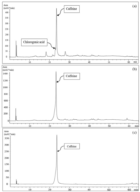 The caffeine and chlorogenic acid content in the extracts, expressed as milligrams per gram of dried SCG, were investigated by using high-performance liquid chromatography (HPLC, Agilent, 1100 Series, Palo Alto, CA, USA) equipped with a C18 phase column (Model 201TP54, Vydac, Hesperia, CA, USA), combined with a diode-array detector (DAD), following the method described by Aliakbarian et al. [43].