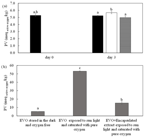 EVO and 10% w/v encapsulated HPTE extract stored in the dark and oxygen free; (b) Comparison among the PV of control sample (EVO stored in the dark and oxygen free), the stressed EVO (EVO exposed to sunlight after 3 days) and the stressed EVO with the extract (EVO + encapsulated extract exposed to sunlight and saturated with pure oxygen). Different letters correspond to significant statistical differences among the data (Tukey’s post hoc test).