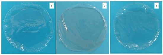(a) Films obtained after the optimization of the PLA-based film production process (polymer-to-solvent ratio = 8% w/v, extract 0%); (b) film enriched with the hydroalcoholic extract (polymer-to-solvent ratio = 8% w/v, theoretical loading = 512 μgcaffeine/gPLA); (c) film enriched with LLE extract (polymer-to-solvent ratio = 8% w/v, theoretical loading = 1494 μgcaffeine/gPLA).
