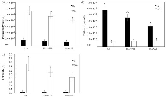 (a) Permeabilities, (b) diffusivities, and (c) solubilities of O2 and CO2 through the blank sample and those enriched with the hydroalcoholic extract (HPTE) and the extract further purified (LLE), with caffeine contents of 512 μg caffeine/g PLA and 1494 μg caffeine/g PLA, respectively. Different letters within the same data series correspond to significant statistical differences among the data (Tukey’s post hoc test).