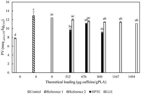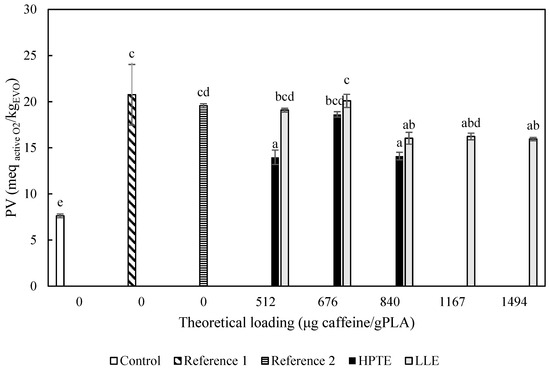 Peroxide value of EVO samples exposed to UV light for three days and sunlight for a further three days, at room temperature. Control = EVO stored in the dark; Reference 1 = EVO exposed to UV light; Reference 2 = EVO exposed to UV light and put in contact with the reference film (42.4 cm2); HPTE = EVO exposed to UV light and put in contact with the films (42.4 cm2) loaded with HPTE extract; LLE = EVO exposed to UV light and put in contact with the films (42.4 cm2) loaded with HPTE extract. Different letters correspond to significant statistical differences among the data (Tukey’s post hoc test).