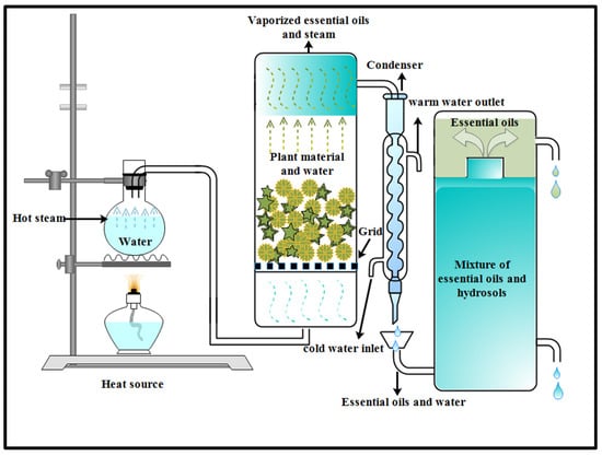 Diagram illustrating essential oil extraction by the hydrodistillation method.