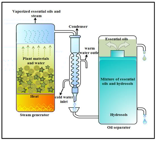 Steam distillation is an extraction practice that is suitable for the separation of aromatic compounds of essential oils from temperature-sensitive plants [32]. The oil-containing materials placed in the distillation equipment without maceration are exposed to steam. The injected steam break opens the pores and releases the oil content by passing through the raw biomaterial. The system produces a mixture of vapor and raw essential oil, which are condensed, and the vapor is eliminated to obtain the essential oil [33]. Depending on the plant material and oil extraction difficulties, the procedure can be performed under various temperatures but it should be high enough to break down the cell structure to release the essential oil or aromatic compounds [34]. A new procedure was developed to enhance oil yield and decrease polar molecule loss in wastewater during steam distillation. In this system, the plant material sits above the steam source, as shown in Figure 1, so only the steam passes through it. This process requires a minimum amount of steam, which results in less water content in the distillate. Moreover, the dissolution of water-soluble compounds in the aqueous fraction of the condensate is also reduced [35]. Steam distillation extracts 93% of essential oils, but other techniques can be used to extract the remaining 7%. Since the operating temperature hardly goes over 100 °C, it has the advantage of inducing low thermal oil degradation, as reported by Yildirim, Cakir [36]. Also, the amount and the quantity of heat can be efficiently controlled. Apart from the useful aspects of technique, it also has a few disadvantages. Uniform material distribution, size, and packing are crucial in distillation to avoid steam blockage; moreover, the capital investment required for this process is large and it is very expensive for low-price products.