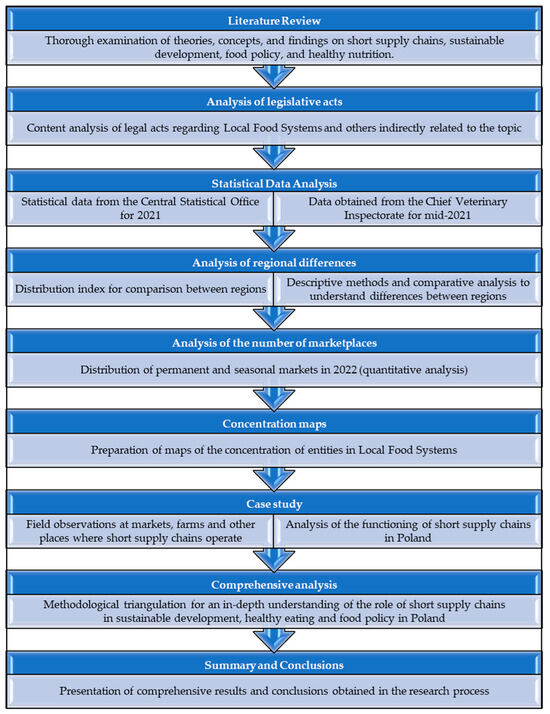 This paper presents a comprehensive research methodology for analyzing short supply chains’ role in sustainable development, food policy, and healthy eating in Poland. The sequence of procedures in this study is presented in the diagram below (Figure 1).