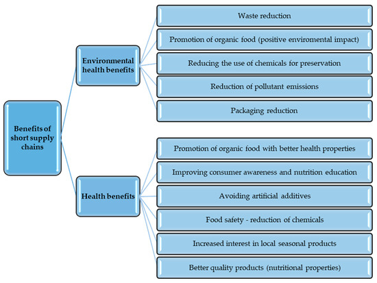 It should be emphasized that the problem of healthy eating and access to high-quality food has become one of the main challenges for societies worldwide. We are becoming increasingly aware that our eating habits have a crucial impact on health and quality of life. However, pollution, long distances between producers and consumers, and dependence on supermarket chains make accessing fresh and healthy food more difficult. Hence, the already mentioned short supply chains answer these challenges. Their benefits are indicated in Figure 3.