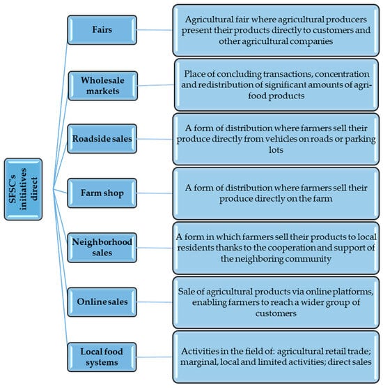 As already mentioned, the direct initiatives of the SFSC are characterized by a straightforward approach to the sale of agricultural products, enabling producers to establish closer contact with customers and other companies operating in the sector (Figure 3). These various sales methods offer innovative approaches to distribution, allowing to effectively reach local markets and meet the growing demand for fresh and locally sourced food products. In agricultural markets, producers can directly present their products to customers and enterprises related to the agri-food industry. It is a place where the exchange of information, knowledge, and experience plays a key role, and customers can establish direct contact with producers and learn more about production processes and the origin of products. On the other hand, wholesale markets are a platform for the concentration and redistribution of larger quantities of agri-food products. Here, transactions are made on a larger scale, which allows for products to be delivered to various destinations, including retail stores and restaurants. Forms of sale such as road sales and farm supply stores enable farmers to sell their products directly, eliminating intermediaries and allowing greater control over prices and quality. Roadside and farm sales are an innovative approach to reaching customers, which contributes to increasing the public awareness of local products. An important concept within the SFSC is also neighborhood selling, which is based on the cooperation and support of the local community. Here, farmers sell their produce to residents, creating a link between producers and consumers and strengthening the local economy. It should be noted that, in the digital transformation era, online sales are becoming an essential tool for farmers, allowing them to reach a broader range of customers through online platforms. This enables the sale of agricultural products on a larger scale while maintaining direct contact between the producer and the consumer. Many of the initiatives focus on creating local food systems, where agricultural retail, marginal activities, and direct sales play a crucial role. Striving to ensure access to fresh, locally sourced products becomes the foundation for a sustainable and socially responsible food future.