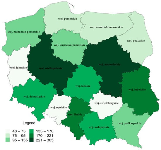 As mentioned, marketplaces are important entities operating in short food supply channels. In 2021, there were a total of 2116 permanent marketplaces in Poland. This number reflects the presence of local commercial markets in different parts of the country. The regions with the highest number of marketplaces include Mazowieckie and Wielkopolskie. Mazowieckie has the most considerable number of permanent marketplaces (305 marketplaces) (Figure 7). This is understandable given the area’s economic and population importance. Wielkopolskie is another region with many permanent markets, which may result from this area’s commercial and agricultural traditions (221 markets). In the case of regions with the smallest number of marketplaces, Lubuskie should be indicated—73 marketplaces and the Opolskie—48 marketplaces. The distribution analysis shows that the numbers of permanent marketplaces in individual regions differs significantly. This distribution may be related to the economic, geographical, and cultural conditions of the regions. It should be noted that areas with fewer markets may require support and the development of commercial infrastructure. It is an essential tool for decision makers to shape the policy of supporting local trade and promoting the trade fair tradition in various regions of Poland.