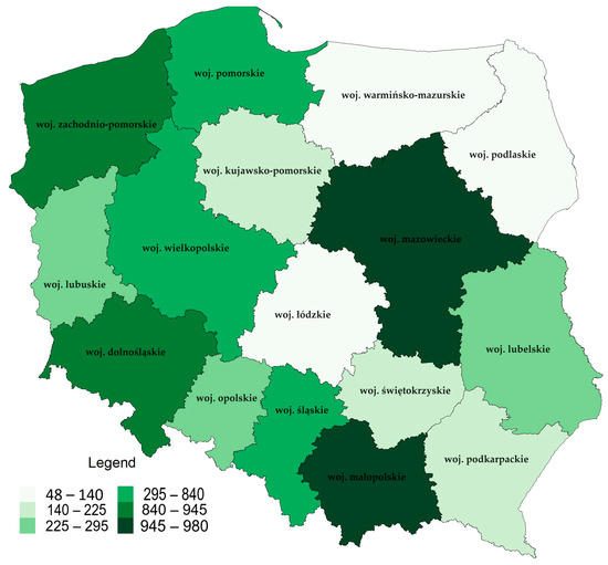 In 2022, 6637 seasonal markets were present in Poland (Figure 8). This figure shows the sector’s massive impact on local economies and how it varies across the country regarding short supply channels. The statistics show that Mazowieckie is the area with the highest number of seasonal markets—980. Among the leaders in this respect, it is also worth mentioning Małopolskie—945 marketplaces, Zachodniopomorskie—932 marketplaces, Dolnośląskie—840 marketplaces, and Śląskie—810 marketplaces.