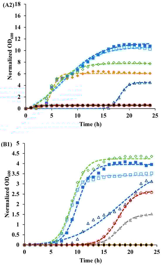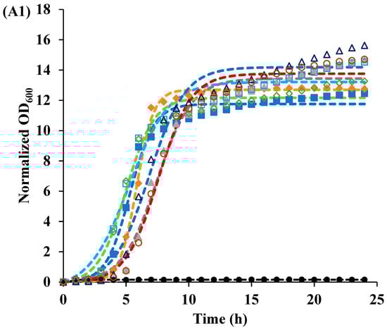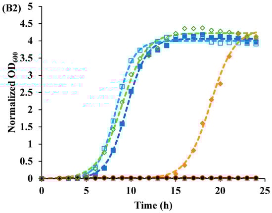 The ratio of the momentary OD600 value to the initial OD600 value is represented by Y(t). The asymptotic value of the growth curve is represented by “a”, the growth rate is represented by “k”, and the inflection point of the growth curve is represented by “tc”. The experimental data were fit with Equation (1) using a nonlinear regression routine in Mathematica 12.2 (Wolfram Research, Inc. Champaign, IL, USA). The accuracy of the fit was determined based on the mean squared error.