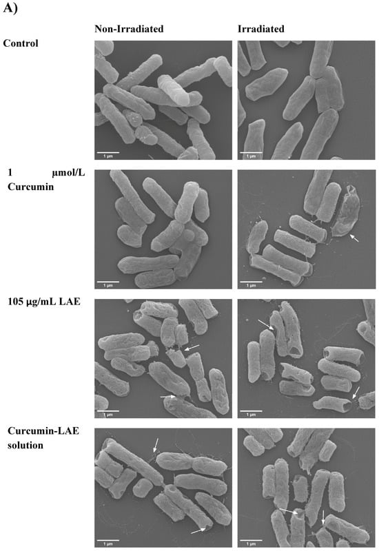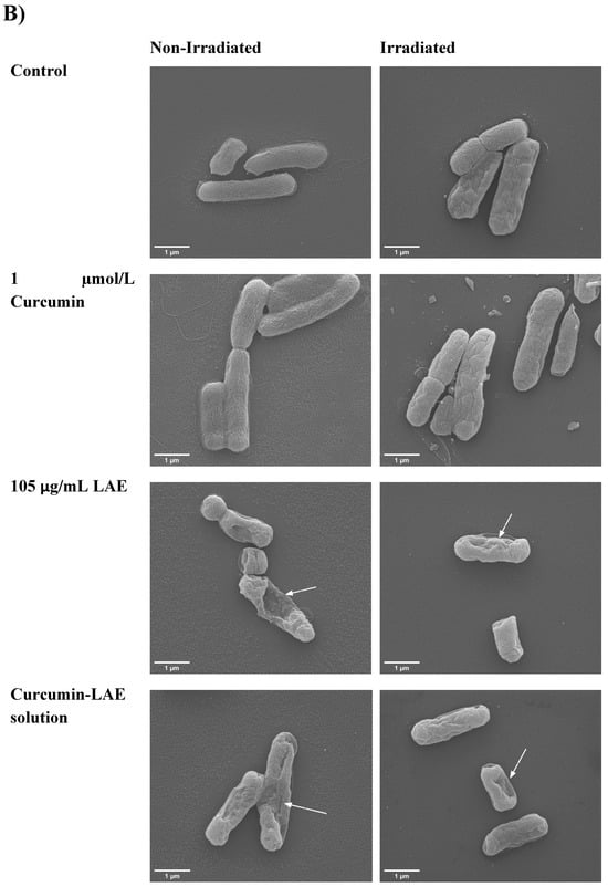 SEM micrograph of a non-irradiated and irradiated cocktail of E. coli treated with curcumin, LAE, or curcumin-LAE solutions at (A) pH 3.5 and (B) pH 7. The white arrows indicate damaged cell surfaces.