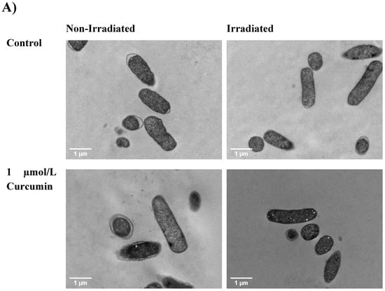 The recovery of bacteria after photoinactivation was determined. First, 100 µL of the treated samples, diluted 1:10 in a corresponding 5 mmol/L sodium citrate buffer, was mixed with 100 µL of growth medium (TSB) in each well of a 96-well plate. This dilution in TSB prevented further photoinactivation by curcumin because the resulting solution was at pH 7 []. The OD600 of the samples was obtained using a microplate reader (Synergy H1, Biotek Instrument Inc., Santa Clara, CA, USA) every 1 h for 24 h at 37 °C with shaking for 30 s. The obtained data were exported using imager software (Gen 5, version 3.11, Biotek Instrument Inc., Santa Clara, CA, USA).