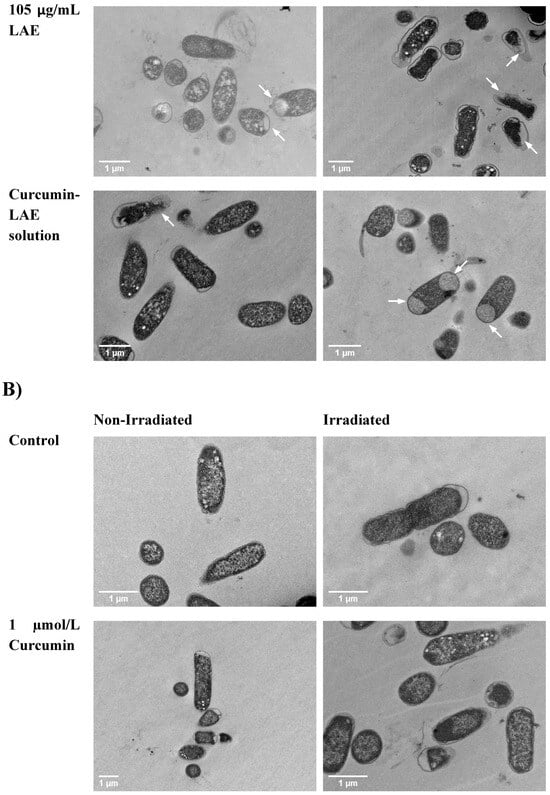 TEM micrograph of a non-irradiated and irradiated cocktail of E. coli treated with curcumin, LAE, or curcumin-LAE solutions at (A) pH 3.5 and (B) pH 7. The white arrows indicate dissolution of the cellular membrane or formation of the membrane channel.