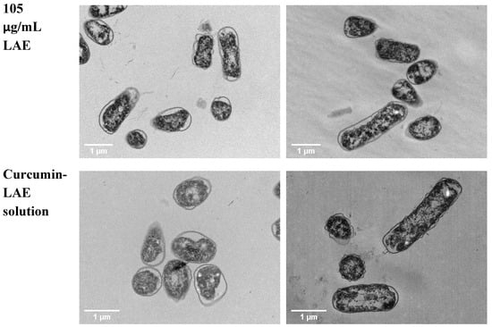 The cell morphology of bacteria also changed when different components of curcumin-LAE solutions were individually used for treatment. For E. coli, all samples with LAE showed dissolution of the cell membrane. For samples with LAE at pH 3.5, some E. coli cells exhibited large white spots that could indicate either large membrane channels due to solubilization of the outer membrane or cytoplasmic collapse (Figure 3) [,]. At pH 7, E. coli treated with solutions including LAE caused the cytoplasmic membrane to exhibit intracytoplasmic coagulation and condensation, which could be seen by black clumps on the edge of the cell []. Coagulated material found in the cytoplasm might be a result of abnormal protein microprecipitation or the denaturation of membrane components []. For L. innocua, there were indications of cell leakages from the ones irradiated with curcumin and those containing LAE in their treatments at both pH 3.5 and 7 (Figure S4). Despite the extensive damage observed, there was no indication of lysis in E. coli and L. innocua after being treated with either LAE or curcumin. This was consistent with previous studies which report that LAE and curcumin alone do not lyse the cells [,,]. The extent of disruption to the cell membrane is also dependent on the fluence of light employed during treatment. An increase in dosage when using methylene blue as a PS has been shown to correspond with a higher number of membrane vesicles or bulges in E. coli []. Therefore, the treatment using curcumin-LAE solution in this study was sufficient to inactivate bacteria but did not lyse them.