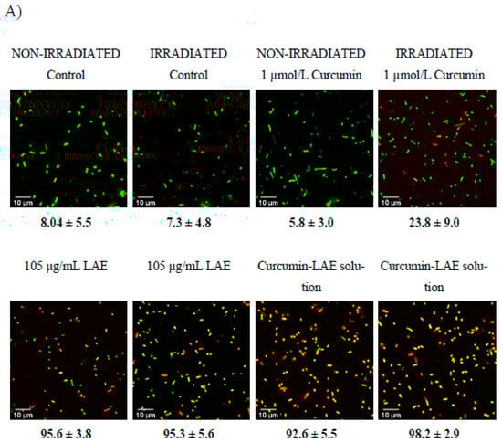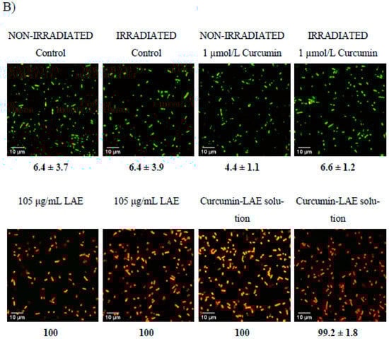 Micrographs of a non-irradiated and irradiated cocktail of E. coli treated with curcumin, LAE, or curcumin-LAE solutions at (A) pH 3.5 and (B) pH 7, stained with Syto9 (green) and propidium iodide (yellow, red). The percentage of the cocktail of E. coli at pH 3.5 or pH 7 with permeable membranes (yellow, red) is listed below each micrograph.