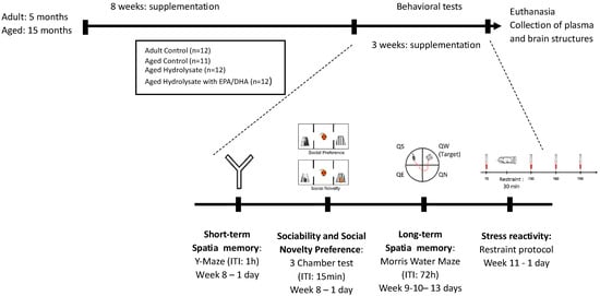 Experimental design. Adult (5 months) and aged (15 months) mice were fed the control diet or the hydrolysate-enriched diets for 8 weeks. Behavioral tests were performed during the next 3 weeks. Total supplementation duration was 11 weeks. DHA: docosahexaenoic acid; EPA: eicosapentaenoic acid; ITI: inter-trial interval; QE: quadrant east, QN: quadrant north; QS: quadrant south; QW: quadrant west.
