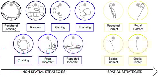 For each trial in the spatial learning test, we evaluated the navigation path using the categorization system outlined by Bensalem et al. [] (Figure 2). The navigation strategies were classified into two primary categories: nonspatial and spatial strategies. Nonspatial strategies encompassed initial “global search” strategies, such as “peripheral looping” and “random” along with “circling”. Additionally, there were “local search” strategies, including “scanning”, “chaining”, “repeated incorrect”, and “focal incorrect”. Spatial strategies, on the other hand, comprised “repeated correct”, “focal correct”, “spatial indirect”, and “spatial direct”.