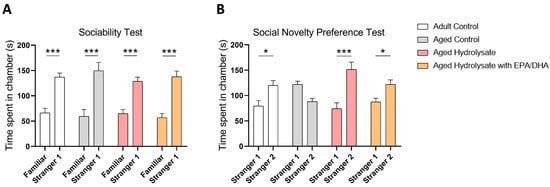 We first evaluated social behavior in the three-chamber test. Each group of mice spent significantly more time exploring social target (stranger 1) than the empty cage (adult control, p < 0.001; aged control, p < 0.001; aged hydrolysate, p < 0.001; aged hydrolysate with EPA/DHA, p < 0.001) (Figure 3A) indicating that aging did not affect social interaction.