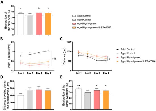 The aged control group presented a lack of recognition for the new arm, while the aged groups fed with supplementations spent significantly more time in this arm (aged hydrolysate, p = 0.004; aged hydrolysate with EPA/DHA, p = 0.03). Hence, the deficit observed in the aged control group was prevented by hydrolysate and hydrolysate with EPA/DHA supplementations.
