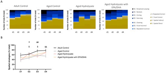 Fish hydrolysate supplementation promotes an earlier use of spatial strategies during spatial learning. (A) Navigational strategies used during spatial learning for each group. (B) Percentage of spatial strategies used by each group for each day of spatial learning. $ p < 0.05, $$ p < 0.01 Adult Control vs. Aged Control; ## p < 0.01 Adult Control vs. Aged Hydrolysate; * p < 0.05 Aged Hydrolysate vs. Aged Control, n = 11–13 per group. NS: non-spatial strategies; S: spatial strategies.