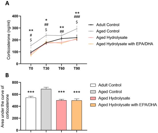 The area under the curve (AUC) of corticosterone was significantly increased by age (p < 0.001), and this was rescued by both supplementations (aged hydrolysate, p < 0.001, aged hydrolysate with EPA/DHA, p < 0.001) (Figure 6B).