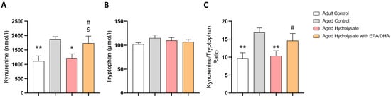 The level of Kyn and the Kyn/Trp ratio were higher in the aged control mice than in the adult control mice (p = 0.006, p = 0.003, respectively) (Figure 7A,C). Interestingly, the Kyn level and the Kyn/Trp ratio were restored similar to the adult control’s level in aged hydrolysate mice (p = 0.02; p = 0.006, respectively) but not in the aged hydrolysate with EPA/DHA group. Age and supplementation had no effect on the level of Tryp (Figure 7B).