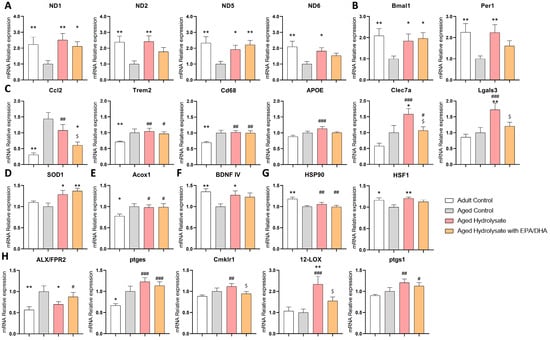 Both supplementations modulate gene expression changes associated with aging. (A) Mitochondrial respiratory Complex I. (B) Circadian clock. (C) Microglial neurodegenerative phenotype. (D) Antioxidant defenses. (E) beta-oxidation. (F) Neuroprotection. (G) Heat shock responses. (H) Oxylipins pathway. * p < 0.05, ** p < 0.01 vs. Aged Control; # p < 0.05, ## p < 0.01, ### p < 0.001 vs. Adult Control; $ p < 0.05 vs. Aged Hydrolysate. n = 11–12 per group.