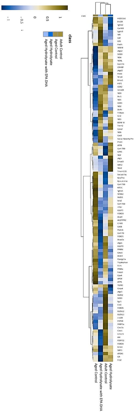 Finally, we performed a multivariate analysis. The result of a hierarchical clustering is displayed in a heat map as a dendrogram (Figure 9). Column dendrograms show the distance (or similarity) among the gene expression, behavioral results, and stress response. Row dendrograms show the distance (or similarity) between groups and which nodes each group belongs to as a result of the clustering calculation. Column dendrograms discriminated two clusters of parameters. The first cluster was composed of downregulated variables (blue color) in the aged control group compared to the adult control group. This cluster integrated genes from the mitochondrial respiratory chain (ND1, ND2, ND3, ND4, ND4L, ND5, ND6, COX1, and COX2), circadian clock (Per1, Bmal1), antioxidant defenses (SOD3), and behavioral variables that were altered in aged mice (social novelty preference, MWM and Y-maze). The second cluster was composed of upregulated parameters (red color) in the aged control group compared to the adult control: the stress response (corticosterone level), levels of kynurenine and tryptophan, and Kyn/Trp ratio. Then, row dendrograms separated the aged control group and the adult control group into two different clusters. Column dendrograms confirmed similarity between the adult control group and both supplemented groups. Indeed, both supplementations restored social novelty preference, MWM, and Y-maze parameters at the same level as in the adult control group. They also restored parameters from the stress response (corticosterone level), levels of Kyn and Trp, and Kyn/Trp ratio. From these results, both the aged-supplemented group and the adult control group were gathered in the same cluster. Further in the classification, the aged hydrolysate group is gathered with the adult control group suggesting a stronger similarity between these two groups.