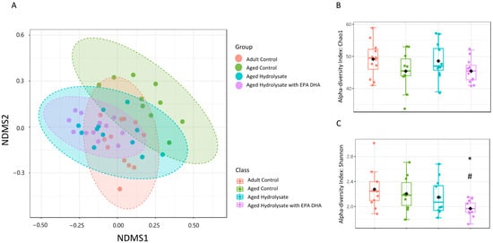 Microbial diversity analysis. (A) NMDS (non-metric multidimensional scaling). The closer the distance, the higher is the similarity. (B) Chao1 index. (C) Shannon index. * p < 0.05 vs. Aged Control; # p < 0.05 vs. Adult Control. n = 11–12 per group.