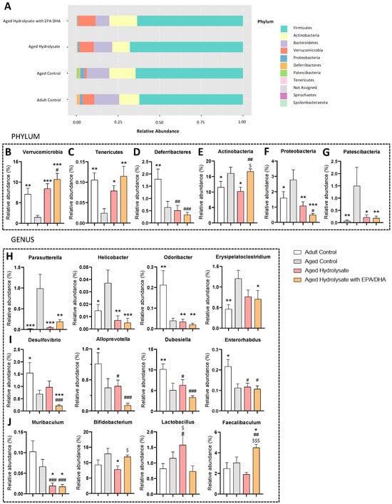 Verrucomicrobia (Figure 11B) and Tenericutes (Figure 11C) relative abundance was significantly decreased by age (p = 0.005; p = 0.003, respectively), and this was reversed by both supplementations (Verrucomicrobia, aged hydrolysate, p < 0.001, aged hydrolysate with EPA/DHA, p < 0.001; Tenericutes, aged hydrolysate, p = 0.04, aged hydrolysate with EPA/DHA, p = 0.001). Deferribacteres abundance was significantly decreased in the aged control group and in both supplemented groups as compared to the adult control group (aged control, p = 0.006; aged hydrolysate, p = 0.002; aged hydrolysate with EPA/DHA, p < 0.001) (Figure 11D).