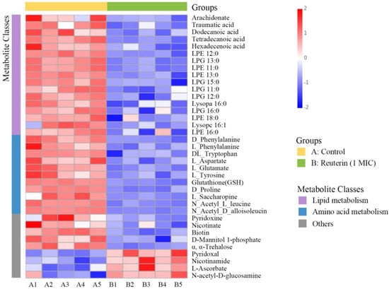 3.3. Untargeted Metabolomic Analysis of S. aureus Treated with Reuterin