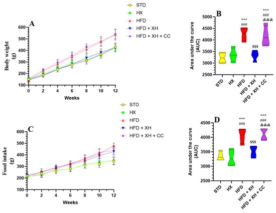 Body weight and food intake were progressively increased through the 12 weeks of the study in all groups of rats (Figure 1A–D). No significant variations in body weight gain and food intake were seen in the control (STD-fed) and XH-treated rats (Figure 1A–D). Body weight and food intake were significantly increased in HFD-fed rats as compared to the STD group, both of which were reduced to basal levels in HFD-fed rats (Figure 1A–D). No significant variations in body weight gain and food intake were seen between the HFD-fed rats and HFD + XH + CC-treated rats (Figure 1A–D).