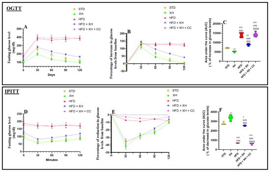 Data of oral glucose (OGTT) (A–C) and intraperitoneal insulin tolerance tests (IPITT)(D–F) in all groups of rats. Data are presented as means ± SD for n = 8 rats/group. (*, **, ***): significantly differed with STD group at p < 0.05, 0.01, and 0.001, respectively; (###): significantly differed with XH-treated group at p < 0.001; ($$$): significantly differed with HFD group at p < 0.001; (&&&): significantly differed with HFD + XH group at p < 0.001. UAC: urea under the curve.