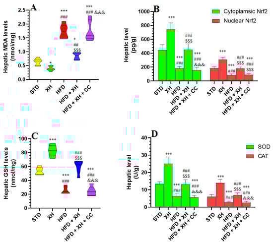Levels of MDA were significantly reduced, whereas the cytoplasmic and nuclear levels of Nrf2, as well as levels of GSH, SOD, and CAT, were increased in the livers of HFD-fed rats as compared to STD-fed rats (Figure 3A–D). Levels of MDA were significantly increased, whereas the cytoplasmic and nuclear levels of Nrf2, as well as levels of SOD and GSH, and CAT, were reduced in the livers of HFD-fed rats as compared to HFD-fed rats (Figure 3A–D). Livers of the HFD + XH-treated rats showed significantly lower levels of MDA and higher levels of GSH, SOD, and CAT and increased levels of cytoplasmic and nuclear levels of Nrf2 as compared to HFD-fed rats. All these events were reversed in the livers of HFD + XH + CC-treated rats compared to HFD + XH-treated rats, which were not significantly different from those measured in HFD-fed rats (Figure 3A–D).