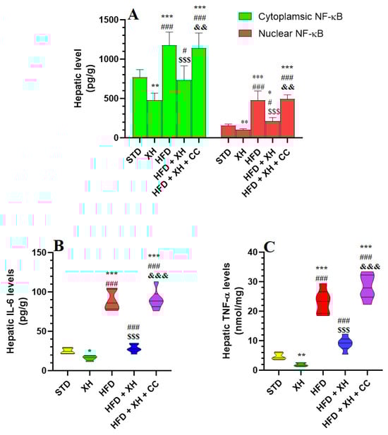 The cytoplasmic land nuclear levels of nuclear factor-kappa beta (NF-κB) (A), as well as levels of interleukin-6 (IL-6) (B) and tumor necrosis factor-α (TNF-α) (C) inflammation in the livers of all groups of rats. Data are presented as means ± SD for n = 8 rats/group. (*, **, ***): significantly differed with STD group at p < 0.05, 0.01, and 0.001, respectively; (#, ###): significantly differed with XH-treated group at p < 0.001; ($$$): significantly differed with HFD group at p < 0.001; (&&, &&&): significantly differed with HFD + XH group at p < 0.001.