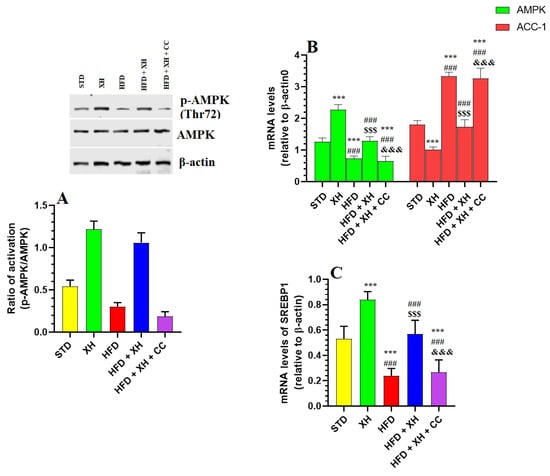 Protein expression of p-AMPK/AMPK (A), as well as mRNA expression of AMPK, SREBP1, and ACC-1 in the livers of HFD-fed rats (B,C). Data are presented as means ± SD for n = 4 rats/group. (***): significantly differed with STD group at p < 0.01 and 0.001, respectively; (###): significantly differed with XH-treated group at p < 0.001; ($$$): significantly differed with HFD group at p < 0.001; (&&&): significantly differed with HFD + XH group at p < 0.001. AMPK: AMPK-activated protein kinase and ACC-1: acetyl-CoA carboxylase.