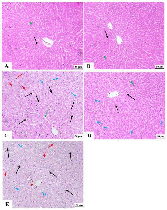 Morphological images for the livers of all groups of rats as stained by hematoxylin and eosin stain (magnification = 200×). (A,B): were taken from control rat and XH-treated rats, respectively, and showed normal histological features, including central vein, hepatocyte (black arrows), and sinusoids (green arrows). (C): Represents HFD-fed rats and showed a massive increase in the number of cytoplasmic fat granules/vacuoles in the majority of the hepatocytes (black arrows). These livers also showed dilated sinusoids (green arrows) and an increased number of infiltrating immune cells (red arrows) and pyknotic cells (blue arrows). (D): was taken from HFD + XH-treated rats and showed much improvement in the structure of hepatocytes (black arrow) and normally sized- sinusoids. However, fat vacuoles were still seen in the hepatocytes that are away from the central vein but in smaller quantities as compared to HFD-fed rats in (C). (E): was taken from HFD + XH + CC and showed almost similar pathological changes to those seen in the HFD-fed rats.