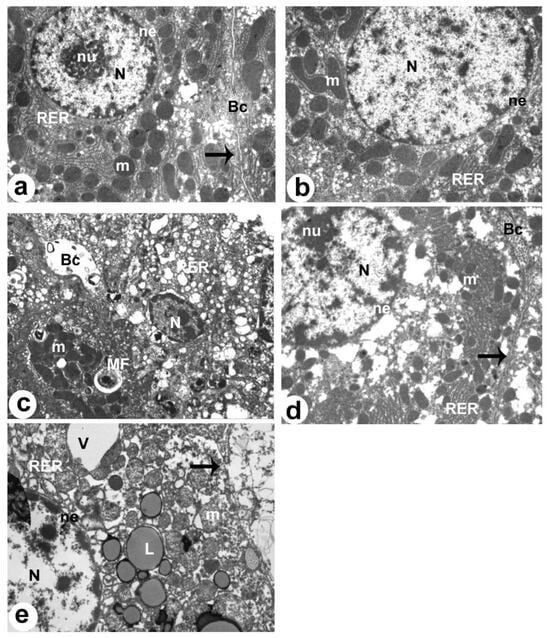 Electron micrographs of the livers of all groups of rats as taken by electron microscopy. (a,b): were taken from control and XH-treated rats. Both livers showed a normal hepatocyte (H) with an intact nucleus (N), rough endoplasmic reticulum (RER), and mitochondria (m). The normally appeared nucleus was surrounded by an intact nuclear envelope (NE) and contained nucleolus (nu) and clear chromatin masses (Chr). The hepatocyte plasma membrane (arrow) was also seen and intact. Normal bile canaliculus (Bc) with intact microvilli were also seen. (c): was taken from NAFLD-treated rats and showed obvious apoptotic and degenerated hepatocytes with pyknotic nucleus (N), increased amounts of lipids (L), and myelin figures (MF). The RER was damaged and dilated. Dilated bile canaliculus (Bc) with damaged microvilli were also seen. (d): was taken from an HFD + XH-treated rat and showed improvement in the structure of the hepatocyte (H) and bile canaliculus (Bc) with partial changes in some mitochondria (m) and the RER. (e): was taken from HFD + XH + CC-treated rats and showed similar ultrastructural changes to those that appeared in the livers of HFD-fed rats with larger lipid droplets (L) and vacuoles (V).