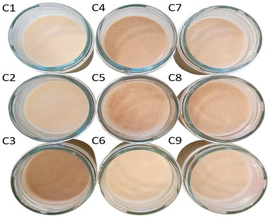 Image of the nine spreadable cheese analogues used in the experiments, labeled from C1 to C9 []. Reprinted/adapted with permission from Ref. []. 2023, MDPI.