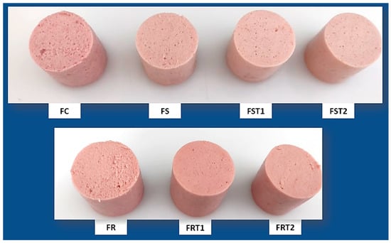 Images of hybrid sausages elaborated with soy or rice proteins and transglutaminase. FC: red meat sausage; FS, FST1, and FST2: soy-based hybrid sausages with 0%, 0.25%, and 0.50% of transglutaminase, respectively; FR, FRT1, and FRT2: rice-based hybrid sausages with 0%, 0.25%, and 0.50% of transglutaminase, respectively.