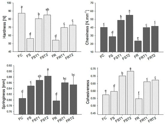 Mean values for texture parameters of hybrid sausages elaborated with soy or rice proteins and transglutaminase. FC: red meat sausage; FS, FST1, and FST2: soy-based hybrid sausages with 0%, 0.25%, and 0.50% of transglutaminase, respectively; FR, FRT1, and FRT2: rice-based hybrid sausages with 0%, 0.25%, and 0.50% of transglutaminase, respectively. Mean values with different letters on the columns of each parameter differ from each other (p ≤ 0.05) according to the post hoc Tukey’s test.