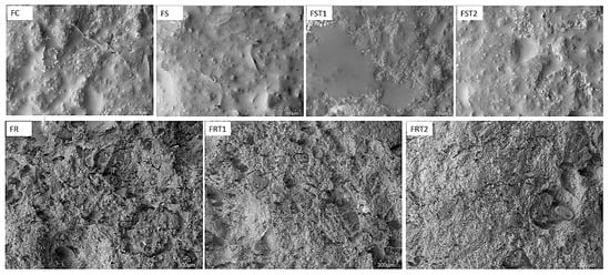 Microstructure images (at a magnification of 150×) of hybrid meat emulsions elaborated with soy or rice proteins and transglutaminase. FC: red meat sausage; FS, FST1, and FST2: soy-based hybrid sausages with 0%, 0.25%, and 0.50% of transglutaminase, respectively; FR, FRT1, and FRT2: rice-based hybrid sausages with 0%, 0.25%, and 0.50% of transglutaminase, respectively.