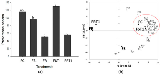 Projective mapping analysis, presented in Figure 5a, supports the ordination preference test outcomes. The first component of the analysis explained 57% of the variation among treatments, effectively separating FC, FS, and FST1 from FR and FRT1 samples. Notably, FST1 was more closely aligned with FC than it was with FS, indicating its higher sensory preference, as can be seen in Figure 5b, as evidenced by the red circle on the internal preference mapping graph. The second component accounted for an additional 18% of the variation and could separate FR from FRT1. FRT1 showed higher water loss during cooking, which likely led to the concentration of salt and other flavor components that adversely affected the sample’s flavor and juiciness, a finding corroborated by attributes like salted, aftertaste, bad flavor, and brittle that were attributed to this treatment in the multiple factor analysis (Figure 5b). Otherwise, FC, FS, and FST1 were positively correlated with desirable sensory attributes, such as juicy, tasty, good aroma, and good appearance.