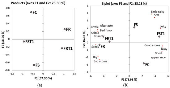 (a) Projective Mapping and (b) Multiple Factor Analysis for hybrid sausages elaborated with soy or rice proteins and transglutaminase. FC: red meat sausage; FS and FST1: soy-based hybrid sausages with 0% and 0.25% of transglutaminase, respectively; FR and FRT1: rice-based hybrid sausages with 0% and 0.25% of transglutaminase, respectively.