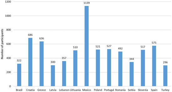The data collection was carried out in 14 countries (Brazil, Croatia, Greece, Latvia, Lebanon, Lithuania, Mexico, Poland, Portugal, Romania, Serbia, Slovenia, Spain, and Turkey) in the second semester of the year 2021, and a total of 7222 participations were recorded. The initial target in each country was to obtain a minimum of 300 responses.