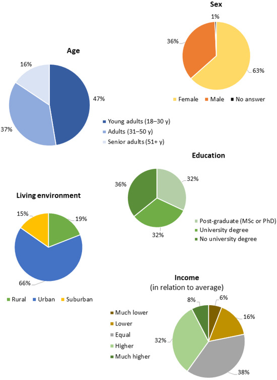 Figure 2 shows the distribution of the participants according to age, sex, education, living environment, and income. The majority of the participants were female (63%), and the age class most represented was young adults (aged between 18 and 30 years, which represented 47% of the sample). With respect to education, 36% did not have a university graduation, while 32% had a university degree and 32% had post-graduate studies. A high percentage of participants resided in urban environments (66%), and most participants (38%) had an income equal to the average income in their own countries.