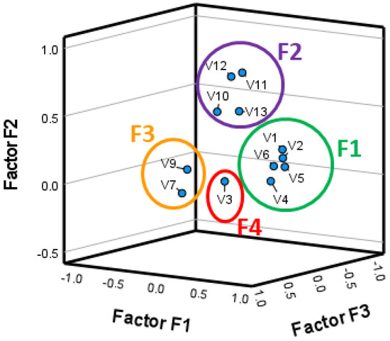 Figure 3 presents a graphical representation of the factors in the rotated space, clearly showing the separation of the four factors. Factor F1 was the most relevant, including five variables (V1, V2, V4, and V6), that, together, explain 22.6% of the total variance. Factor F2 explains 17.0% of the total variance and contains four variables (V10, V11, V12, and V13). Factor F3 contains only two variables (V7 and V8) and explains 12.3% of variance, while the last factor, F4, explains 9.5% of the variance and included only one variable (V3).