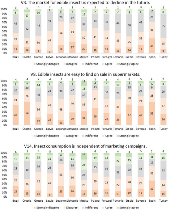 Regarding the results in Figure 4, country differences are visible for all three items. For V3, the false item separated by the FA into one factor, F4, the highest percentage of people who did not manifest an opinion was found for Turkey (55% of indifferent score), and the lowest for Lebanon (20%). Since this statement corresponds to a false affirmation, responding disagreement scores corresponded to a correct perception. Therefore, higher percentages of disagreement scores (1 = strongly disagree and 2 = disagree, altogether) were found for Lebanon (18 + 54 = 72%), Spain (24 + 37 = 71%), and Lithuania (27 + 43 = 70%), revealing a predominance of correct perception in these countries. The two other variables considered to be problematic were items V8 and V14, which were excluded from the FA for not being consistent enough. The results in Figure 4 show that, for V8, the only country where a slightly higher percentage of agreement scores was found (4 = agree and 5 = strongly agree, jointly) was Mexico (13 + 11 = 24%), showing that, in some regions of Mexico, the commercialization of insects is a regular practice. Also, the results for item V14 show a similar trend, with a predominance of positive answers for Mexican participants, with 38% (23 + 15 = 38%) believing that consumption of EIs does not depend on marketing campaigns.